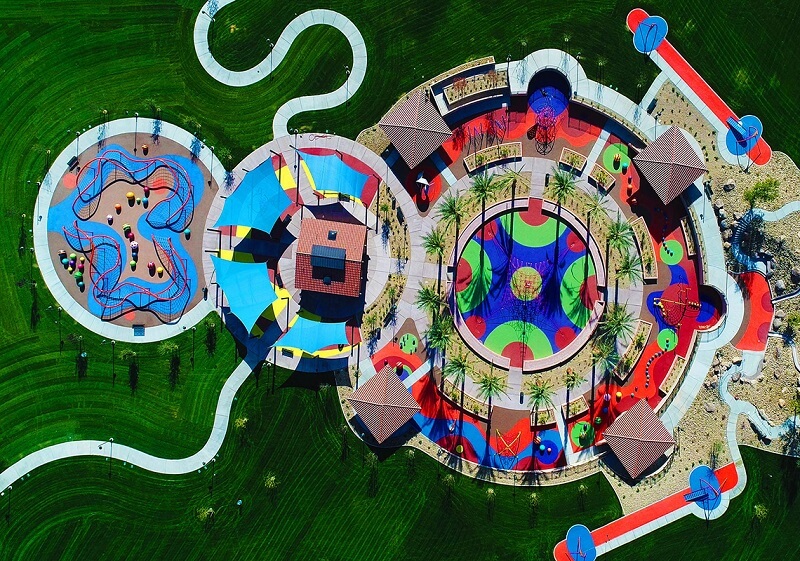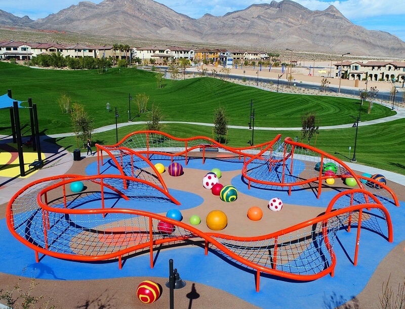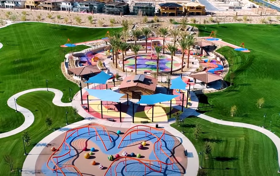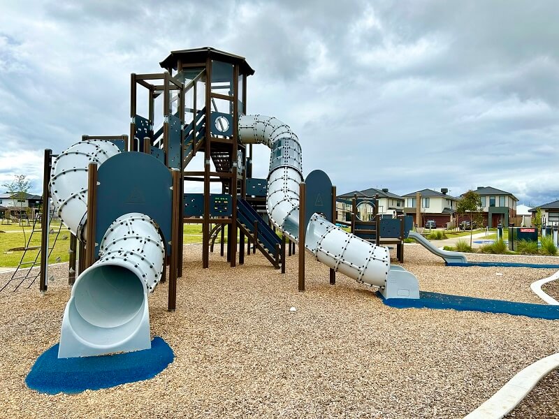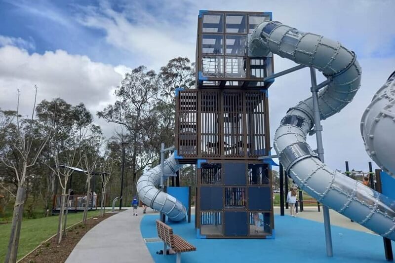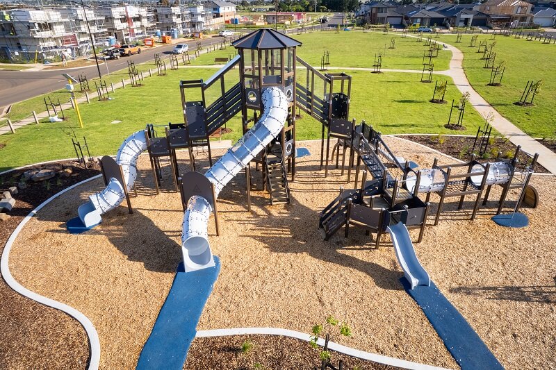 - Features: Huntlee’s new District Park features two striking Cubic tower structures by Lappset, designed to captivate and challenge. The playground showcases a three-level tower that overlooks the entire play area, along with a double-level structure. With a combination of cubes stacked together, the towers invite children to push their limits while exploring multiple slides, tubes, and climbing elements.