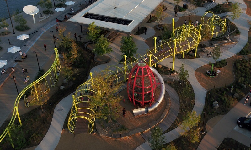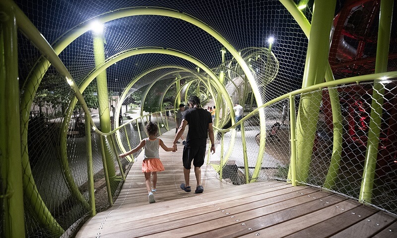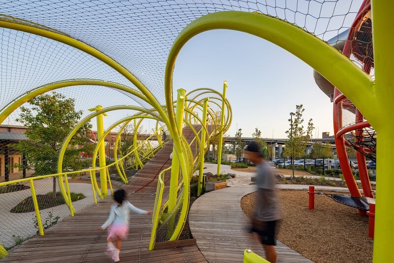 - Features: Designed for durability and year-round enjoyment, the custom walkway structure by Dynamo Playgrounds is built with weather-resistant materials to withstand the elements. The adventure playground at the south end of the site features a range of exciting play elements, including towering climbing structures, an adventure path, a zipline, a log forest, and a swing canopy. Strategically placed lighting ensures the space remains safe and enchanting, creating a captivating atmosphere for evening play.
